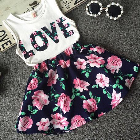 • Description: Love letter printed sleeveless t-shirt with flower skirt two-piece set for girls