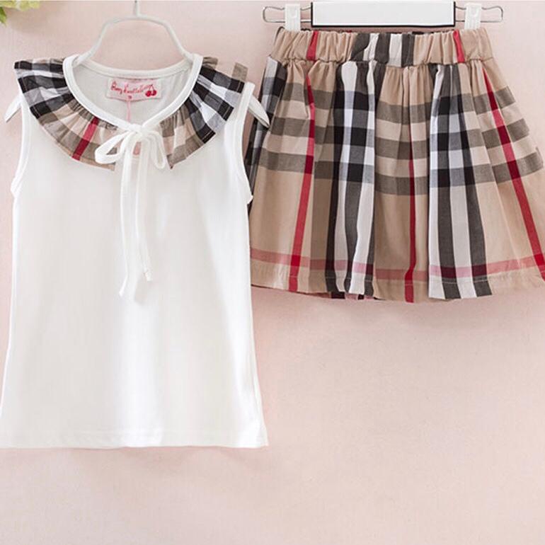 • Description: Girls summer suit Korean style sleeveless grid skirt set for girls