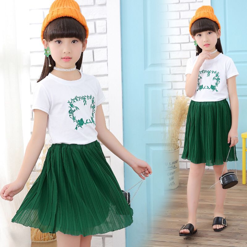 Girls Summer Fashion Princess Two-piece set of Cotton White Short Sleeve Embroidered T-shirt + Green Color Skirt Summer Casual Sets