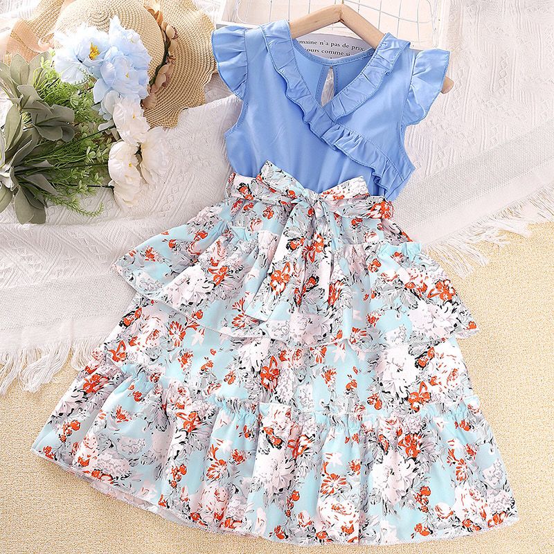 Kids Casual Vest Dress For Girl s Summer 2024 New Children Sleeveless Floral Print Princess Layered Dress with Belt